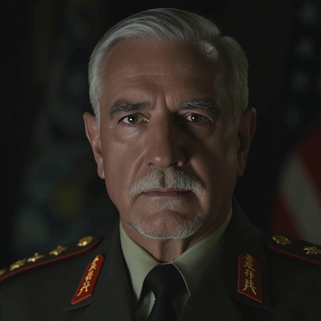 Close-up portrait of a seasoned 62-year-old battle-hardened general, clean-shaven with a chiseled jawline, expression serious and stoic, captured in a cinematic 4k epic detailed shot. The image conveys the weight of experience and authority, using a Kodak lens to achieve a rich, textured depth with detailed bokeh. The atmosphere is dark and moody, akin to a high-stakes HBO drama, highlighting the general's decorated uniform and the intense gaze of a leader who's seen a lifetime of trials.