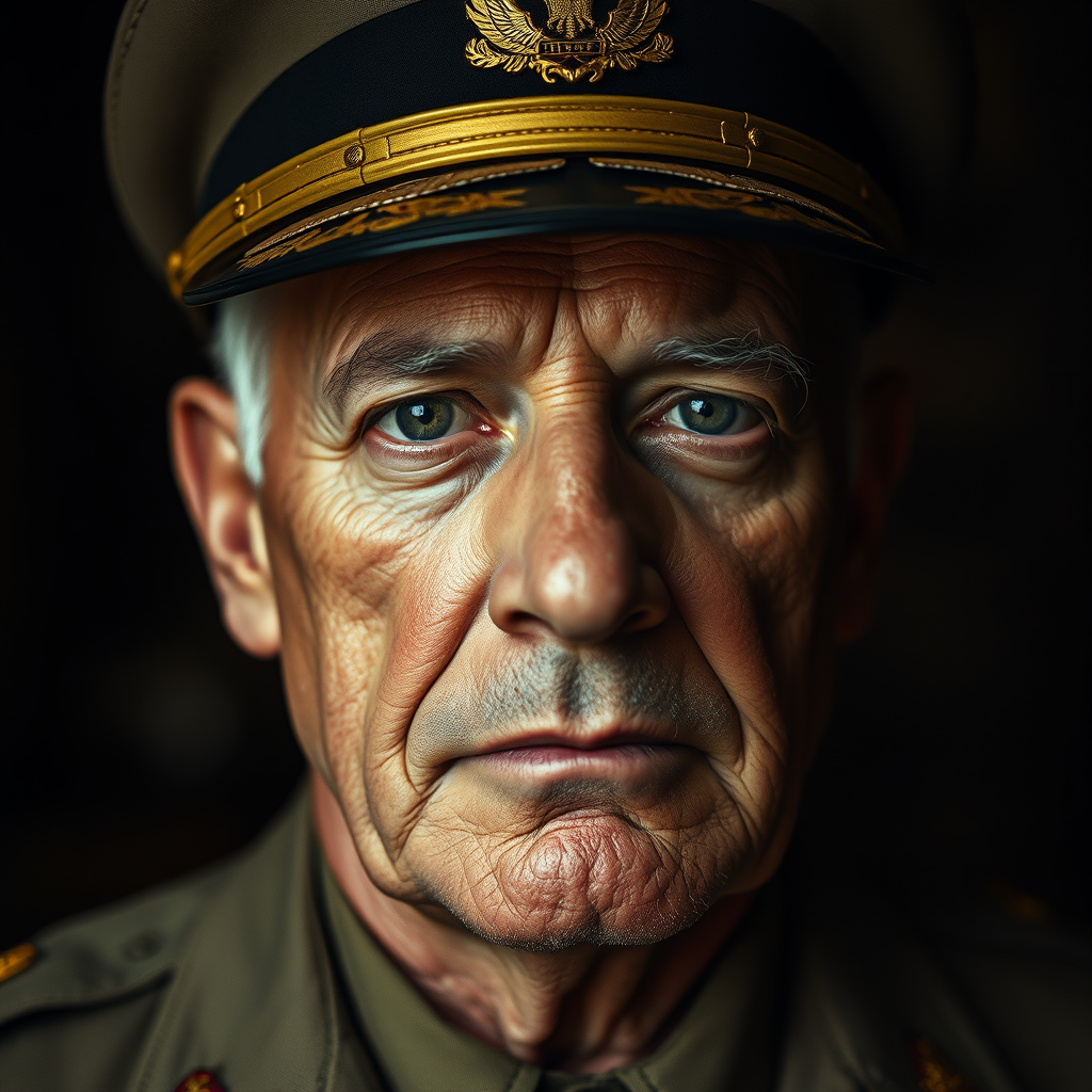 Close-up portrait of a seasoned 62-year-old decorated general, clean-shaven with a serious and stoic demeanor. Captured in a detailed 4k cinematic style, reminiscent of epic HBO dramas. The photograph is shot on Kodak film, featuring a rich and moody bokeh that underscores the character's tough, battle-hardened experience. The general’s eyes convey a lifetime of leadership and resolve, framed in a dark, atmospheric setting with a classic cinematic touch.