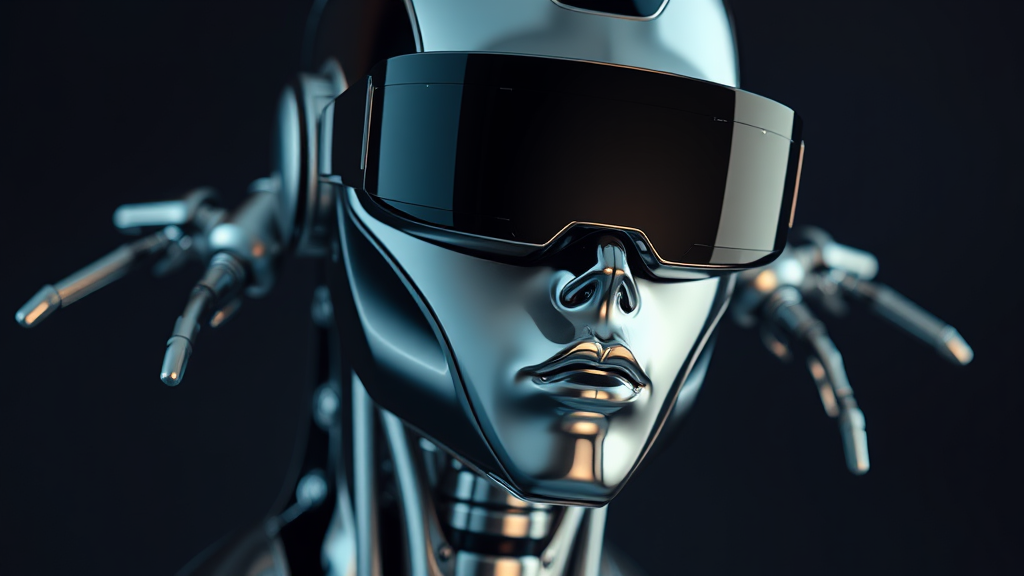 Close-up portrait of a sleek metallic cyborg adorned with futuristic virtual reality visors in place of eyes, its gleaming chrome surface reflecting a spectrum of subtle hues, set against a shadowy backdrop, appearing to defy gravity as it hovers gracefully.