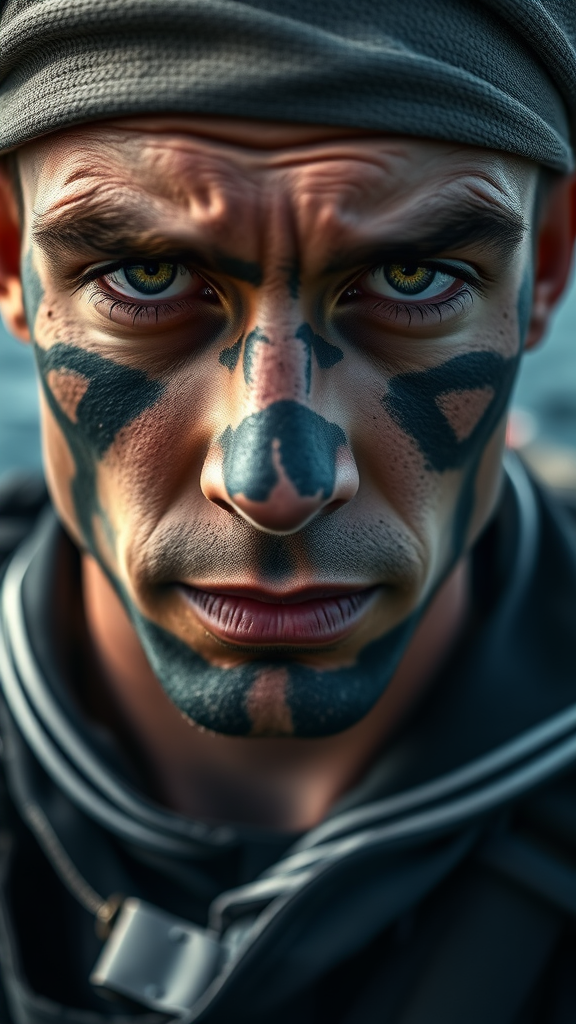 Close-up portrait of a striking navy seal, subtly smeared face paint, piercing green eyes, battle-hardened scars, distinguished navy seal uniform, backdrop of an aircraft carrier at sea, captured with a 50mm lens in soft natural lighting at F1.2 aperture.
