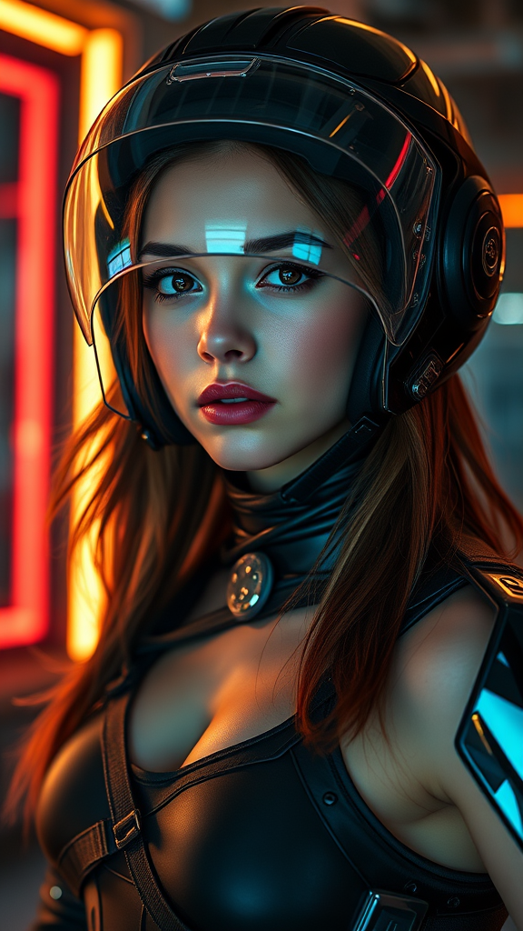 Close-up portrait of a striking young woman with a frowning yet innocent expression, her slender athletic figure captured in a dynamic action pose. Her combat exo-armor suit showcases sleek contours and a closed-system breathing apparatus, complemented by a compact sci-fi cosmic exo helmet with a high-tech glossy transparent visor. The cinematic lighting enhances her helmet’s face, creating a stunning effect. The setting is a highly detailed interior reminiscent of the style seen in TV series like "The Expanse," featuring neon and volumetric lighting that illuminates the room from within. The lighting art contributes a gothic atmosphere, while the Canon EOS 5D Mark IV DSLR captures the scene with precision using an aperture of f/8, shutter speed of 1/250 sec, and ISO 100. The depth of field is expertly controlled to emphasize the hyper-photorealistic details, including natural reflection textures, cinematic lighting on her flowing hair and bare neck, and the subtle reflections in tinted glass elements. Her sheer presence is accentuated by a narrow waist and dynamic posture, evoking a sense of futuristic elegance and power. The scene is devoid of any distortion, maintaining perfect anatomy and proportions, ensuring a clean and professional composition with crisp detail and clarity.
