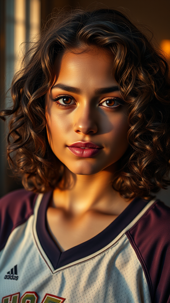 Close-up portrait of a stunning American girl with shoulder-length curly hair, dressed in a stylish sports jersey, set indoors during the enchanting golden hour. The lighting casts dramatic shadows, enhancing the photorealistic qualities, reminiscent of the rich tones of Kodak Portra 800 film. Captured in ultra-high definition, 8k resolution, maintaining a cinematic 9:16 aspect ratio, evocative yet subtly distinctive in its expressive atmosphere.