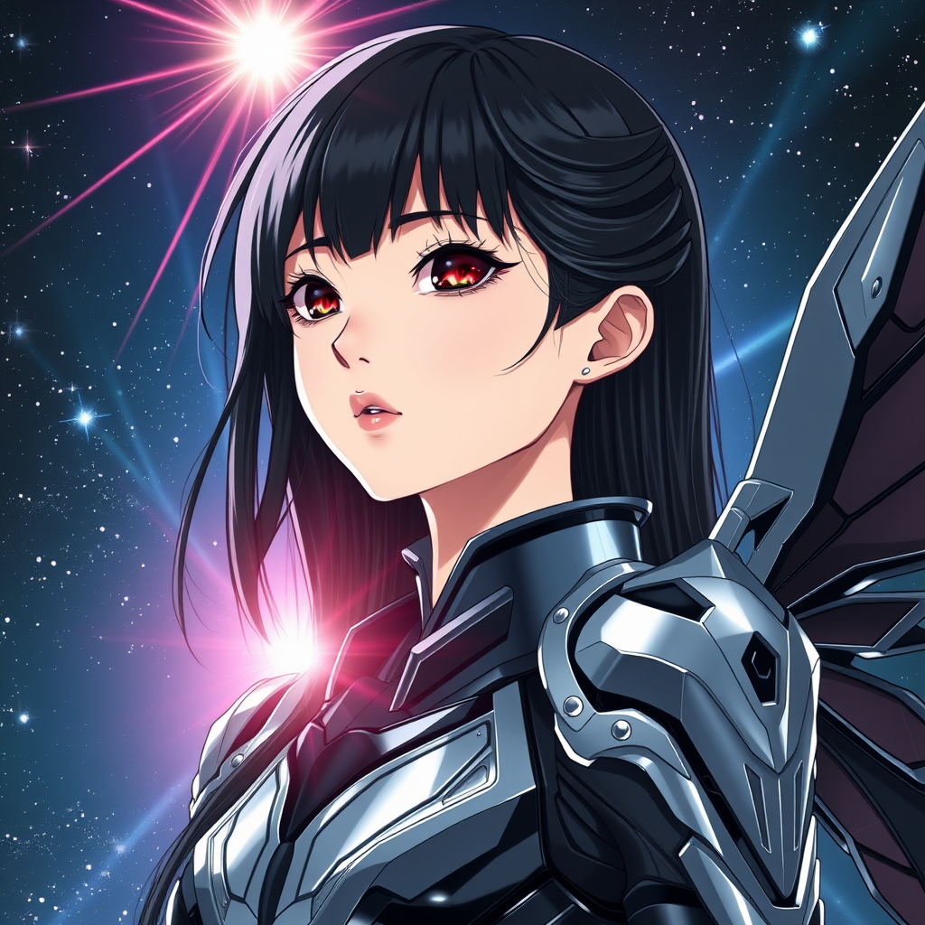 Close-up portrait of a stunning girl in a sleek Sci-fi exo suit, featuring a beautiful, ethereal face and long, jet-black hair. Her slender frame is accentuated by a glossy black-and-silver, highly detailed insectoid Sci-fi mech design, complete with intricate wings. Inspired by the styles of Tsutomu Nihei and Akira, she gazes into the distance, with a radiant quasar illuminating the dramatic outer space background. Volume graphics with anime art and manga drawing elements capture the vastness of the galaxy, highlighted by space starlight and dynamic plasma beams. The scene is brought to life in 8k UHD, showcasing hyper-realistic details and sophisticated lighting effects. The composition maintains the awe-inspiring and cosmic atmosphere of an otherworldly Sci-fi narrative.