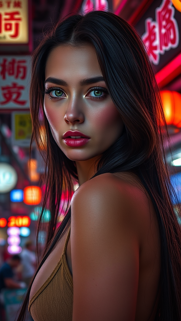 Close-up portrait of a stunning young supermodel with an Asian market background, surrounded by vibrant shop neon signs and night city lights. She has captivating green eyes and a perfect fitness physique with long legs. Her face is beautifully symmetrical with expressive doe eyes, high cheekbones, and long, flowing hair resembling dark ink. She wears delicate makeup and a faintly melancholy expression. Photographic details include aperture 1.8, bokeh effect, subtle lens flare, and extradimensional ambiance. Captured in ultra HD, HDR, 8k resolution with cinematic lighting, this image presents an exceptionally high level of detail, set amidst an Asian market backdrop with dynamic neon glows.