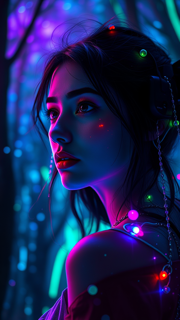 Close-up portrait of a surreal, dream-like woman, off-centered and gazing into the distance, embodying a fusion of daydreampunk style, adorned in cascading neon lights, vibrant and bioluminescent. The scene is set against a mesmerizing forest backdrop that transforms into a vivid neon wonderland, adorned with swirling particles in hues of blue, green, and purple. The composition follows the golden ratio with a hyper-maximalist approach, utilizing octane render for photorealism and cinematic realism, reminiscent of an Unreal Engine production at 8k resolution. The asymmetric composition and elements introduce a sense of chaos and wonder.