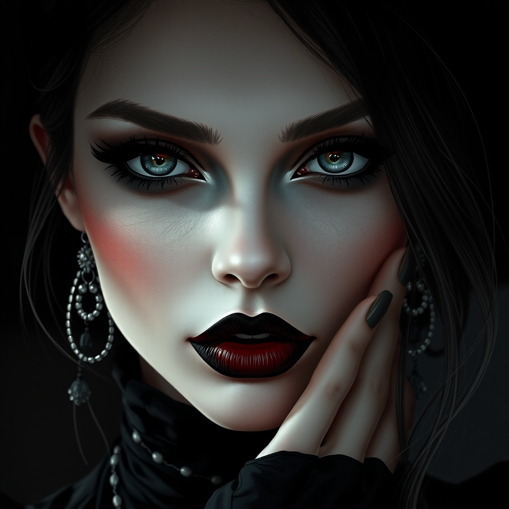 Close-up portrait of a woman in a striking black and white ensemble, embodying the essence of a modern dark witch. Her style is a fusion of elegance and enigma, drawing inspiration from WLOP's ethereal touch. Her features are meticulously detailed, capturing the signature of Guweiz and Loish's artistry. She exudes gothic horror vibes, with an aura that's both mysterious and captivating. The digital art showcases a blend of shadow and light, highlighting her goth-inspired aesthetic and making her dark witch persona intriguingly alluring.