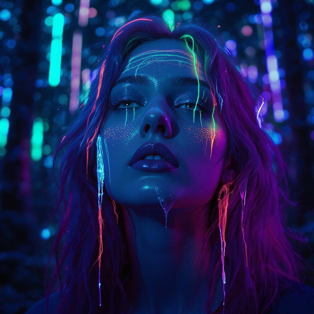 Close-up portrait of a woman with a dream-like, lucid expression, her face slightly off-centered as she gazes into the distance. Her features are vividly illuminated by dripping neon lights, casting colorful, bioluminescent glows across her skin. The background is a surreal forest, transformed into a vivid neon wonderland with shimmering particles in hues of blue, green, and purple. The composition follows the golden ratio, creating a hyper-maximalist visual experience with photorealistic, cinematic details rendered in octane and unreal engine, achieving an 8k resolution with an asymmetrical composition that enhances the dreamlike chaos.