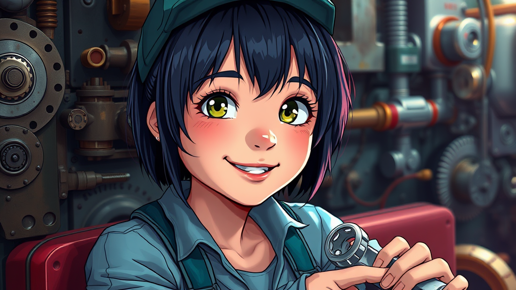 Close-up portrait of a young mechanic girl sitting with a cheerful and energetic expression, enjoying an afternoon in a highly detailed mechanical and dystopian environment. The scene features an intricate backdrop of gears, pipes, and other mechanical elements, adding to the ultra-detailed ambiance. The girl's face is expressive, with detailed eyes, nose, lips, and an innocent appearance. She's surrounded by mechanic tools such as a wrench and a screwdriver, adding to the atmosphere, captured in a vibrant 2D digital illustration style. The design is inspired by the aesthetic of "Ghost in the Shell," with a stunning, rich color palette. Demarcated in 64k Ultra Dynamic Range, the composition is framed to emphasize beauty and mastery while avoiding common errors like cropping or disfigurement, ensuring the depiction maintains its sensibilities without photo-realism.