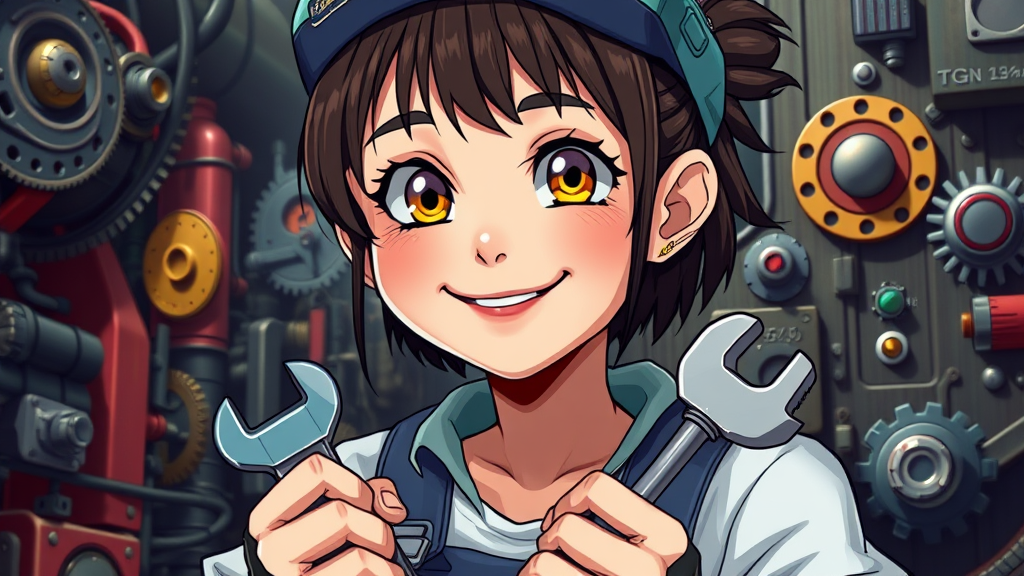 Close-up portrait of a young mechanic girl with a cheerful expression, sitting in a dystopian mechanic workshop. Her face is detailed, with expressive eyes and an innocent look. The background is a richly detailed mechanical setting, featuring intricate gears and gizmos. She holds mechanic tools like a wrench and screwdriver. The illustration is 2D with vibrant colors, capturing a cinematic essence. The design style is inspired by themes from "Ghost in the Shell", emphasizing high detail and artistic quality. Despite the complexity, the scene maintains harmony and beauty, avoiding errors and poorly executed features commonly seen in low-quality illustrations. The composition is coherent, with attention given to proportions and anatomy, ensuring a polished, professional presentation of a unique, two-dimensional character in a fictional environment.
