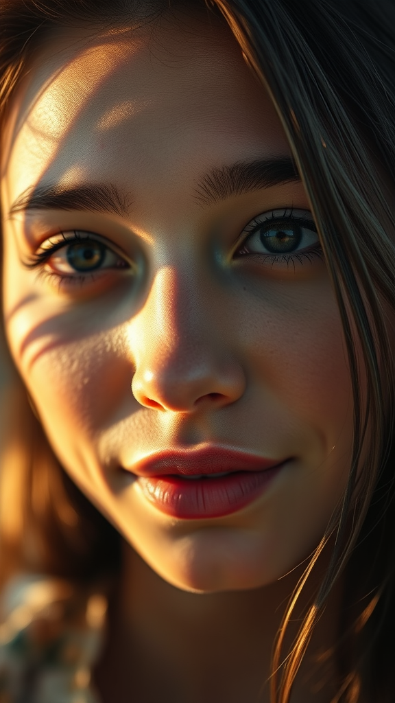 Close-up portrait of a young woman with a beautiful face, capturing the essence of a fresh morning. The photo features a subtle film grain effect, gentle light streaks across her features, enhanced by vivid digital colors, and showcasing a lifelike texture. Add a hint of warm sunlight in the background to enhance the morning ambiance.