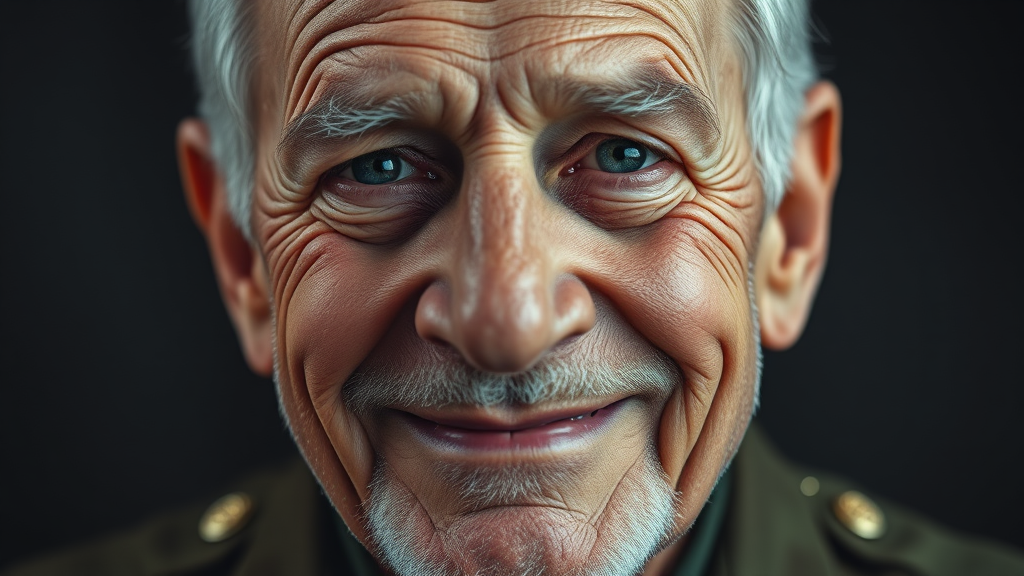 Close-up portrait of an 85-year-old resilient and highly decorated veteran general, clean-shaven, with a warm and gentle smile directed at the camera. His expression is stoic yet inviting, captured in a cinematic, epic style with 4k resolution. Shot with an artistic flair reminiscent of classic Kodak photography, the image reveals intricate details, set against a dark, moody backdrop that enhances the depth and character of his features. Subtle variations in lighting emphasize the wisdom and strength etched into his visage.