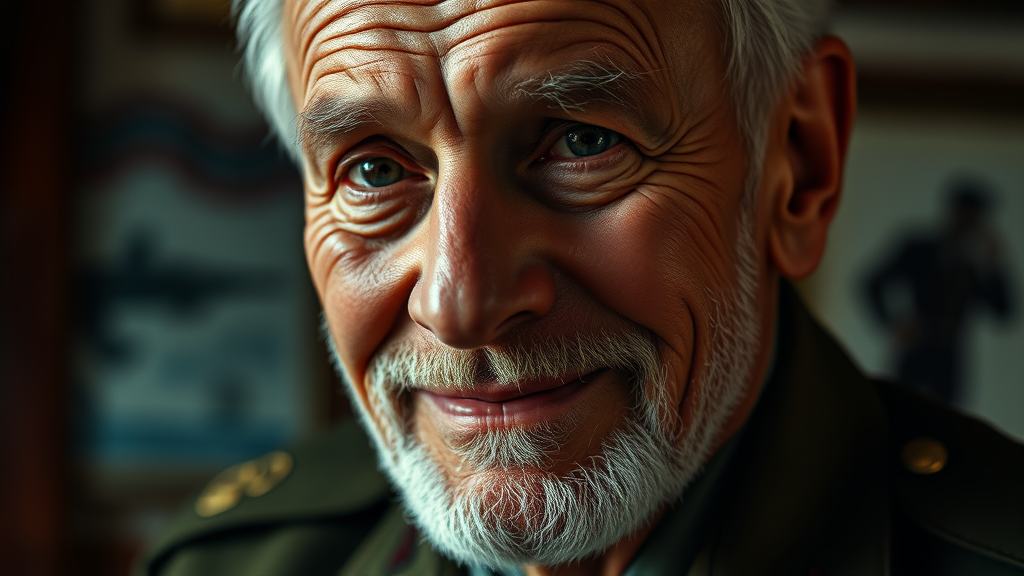 Close-up portrait of an 85-year-old resilient, decorated general with a clean-shaven, kindly smiling demeanor; his wise eyes reflect years of wisdom and strength. The stoic, cinematic atmosphere is captured in stunning 4k resolution, offering an epic and intricate portrayal. Shot on Kodak film, the image is rich in detail with a dark, moody ambiance, enhanced by soft, natural lighting that highlights the texture of his distinguished features. In the background, subtle silhouettes of military memorabilia add depth to this compelling character study.