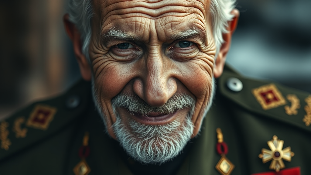Close up portrait of an 85-year-old seasoned general with numerous decorations, clean-shaven and giving a gentle smile to the camera, exuding both strength and warmth, captured in a cinematic and detailed 4k style. The image has an epic quality, with a rich, moody atmosphere reminiscent of classic film shot on Kodak, highlighting the intricate details of his life-worn features and uniform.