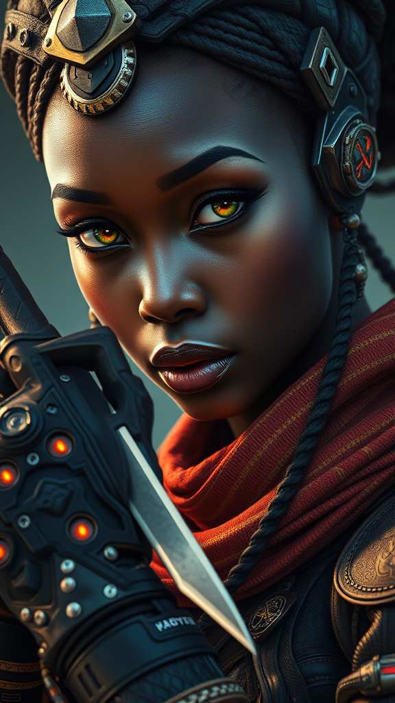 Close-up portrait of an African cyberpunk wizard woman, wielding a knife and wearing a sleek glove; her eyes gleam with intelligence and determination. She embodies a fusion of traditional African and futuristic cyberpunk aesthetics, donning intricate, stylish cybernetic enhancements akin to a mechanoid fashionista. Inspired by Shadowrun's character art, she's a striking teen black cyborg with elaborate steampunk alchemist details, evoking the essence of afrofuturism. Her presence echoes the powerful aura of Loba Andrade from Apex Legends and the iconic Ororo Munroe. The design showcases her as a resourceful cyborg merchant, blending advanced technology with rich cultural heritage in this dynamic cyberpunk character art.