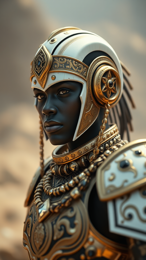 Close-up portrait of an ancient Nubian sovereign emerging into an uncharted expanse, clad in metallic armor of white, black, and gold tones, a regal porcelain visage with subtle mechanical undertones. The scene is infused with a blend of baroque and rococo artistry, captured in cinematic lighting and reflecting the golden ratio, reminiscent of a League of Legends character in a dynamic stance. The armor features an intricate crystal chain, energetic and detailed, with a sigil inscribed in cryptic writing. The setting suggests an air of ritual and mystery, with ornate gold and crystallized black gems shimmering with ambient occlusion. The visual ambiance is high-key photography with 8K resolution, featuring a breathtaking bokeh effect. The scene is enveloped in a metal diamond design, hyper-realistic and photorealistic, showcasing insane detail and intricacy in a hypermaximalist, elegant, and ornate style. Super detailed 8K 3D visuals draw influence from cartoons, anime, and sketches, merging into a harmonious depiction of the surreal and majestic.