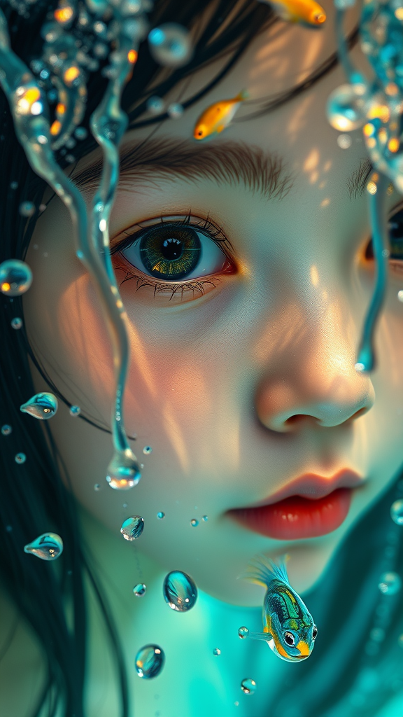 Close-up portrait of an enchanting young girl with a fascination for vibrant, colorful fish, her large, expressive eyes a focal point. Half of her face submerged in water, capturing a dreamy essence in a style reminiscent of Otomo Katsuhiro and Makoto Shinkai. Rendered in hyper-realistic detail, the image glows with swirling hues of yellow and blue. The perspective is exaggerated, showcasing the girl's face interacting with cascading water drops, which exhibit a mother-of-pearl iridescence. Accentuated by a holographic white and subtle green backdrop, the scene captures the beauty of Tyndall effect rendering the air with a shimmering, ethereal light.