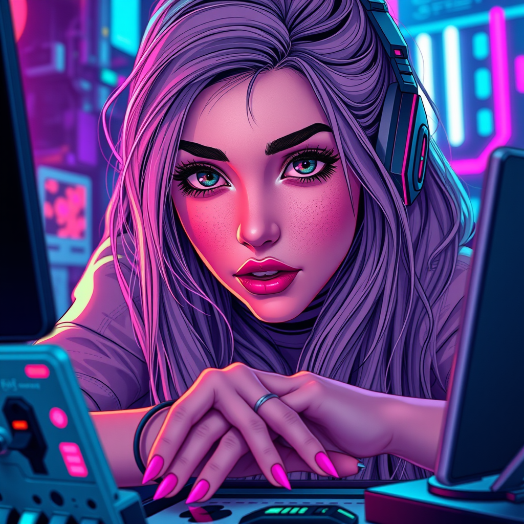 Close-up portrait of an inspired female cyberpunk biohacker at her desk, featuring a vibrant, volumetric atmosphere. Created in the style of Artgerm, the piece showcases a beautiful face and elegant hands with sharp focus. High-resolution digital art with intricate, insanely detailed linework captures the essence of a cyberpunk aesthetic. The scene is filled with neon colors reminiscent of Borderlands, bathed in a comprehensive cinematic presentation. The image is adorned with precise details, offering a breathtaking visual in 4K UHD. It's a key visual masterpiece, trending on ArtStation, highlighting pretty, expressive female eyes. The work avoids common artistic errors, ensuring proper anatomy with no disfigurement or extraneous elements. The design is clear of distractions like text, signatures, or watermarks, focusing solely on the subject's beauty and environment.
