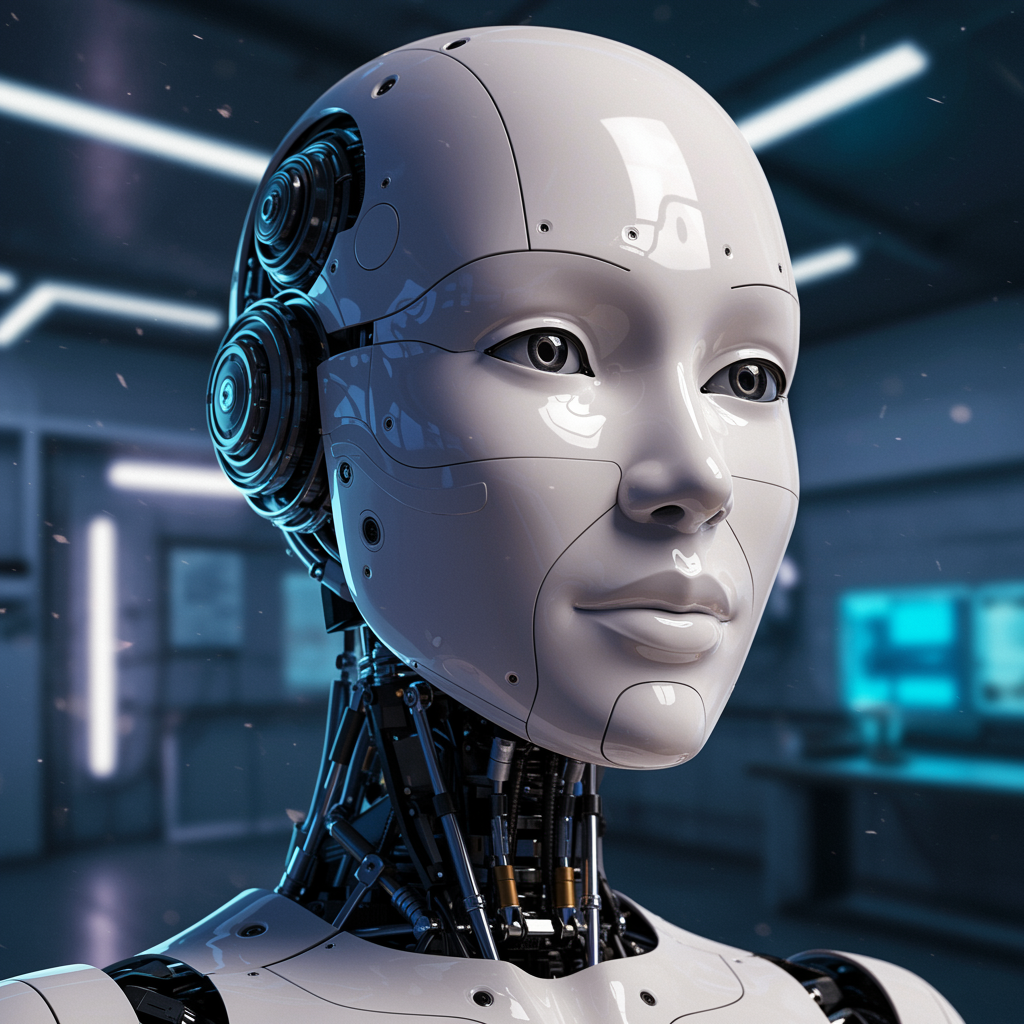 Close up portrait of an intricately designed robotic girl, showcasing the delicate features of a pretty robot with android-like qualities. The humanoid face is detailed, emphasizing the robotic eyes, nose, mouth, and lips. Her detailed robotic body stands against an ultra-detailed futuristic room interior, exuding a vibrant color and contrast within a cinematic, sci-fi theme. The professional shot is rendered in high detail, capturing the essence of a masterpiece. The focus remains on the flawless integration of humanoid beauty with robotic craftsmanship, highlighting her expressive eyes, elegant nose, and lips, set in a futuristic narrative without any distortion or artifacts. Digital illustration that bridges the gap between human and machine, in a vividly imagined future setting.