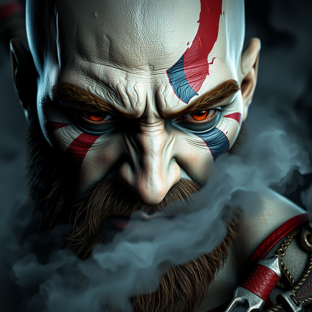 Close up portrait of God of War Kratos, hyperrealism, dramatic composition, intense expression, mist swirling around, rendered with octane, 8k resolution, intricate details, volumetric lighting and hdr effect, high fidelity mixed with low fidelity elements, slightly blurred edges, plastic-like texture, subtle grain, duplicated features, quirky anatomy, oddly positioned limb, embedded text, faint signature, subtle watermark, intentionally reduced quality, noticeable jpeg artifacts.