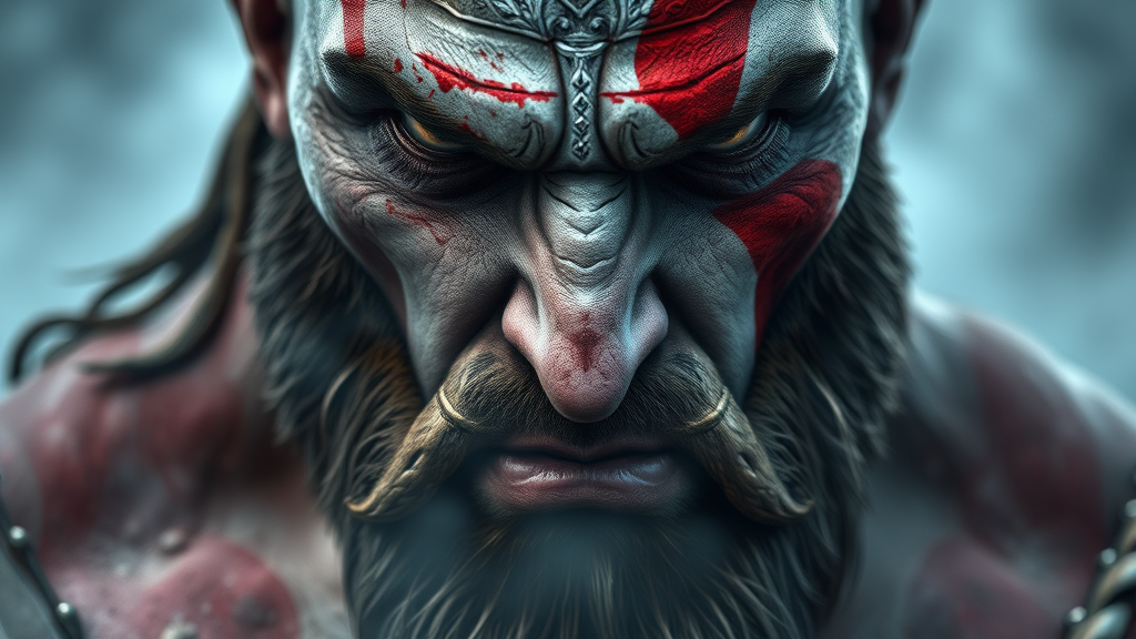 Close up portrait of God of War Kratos, hyperrealism, epic composition, rugged textures, misty ambiance, octane render, 8k resolution, intricate details, volumetric lighting, hdr effects, juxtaposition of high and low quality, slightly blurry, plastic-like sheen, grainy texture, duplicated layers, awkward anatomy, distorted limbs, scattered text elements, indistinct name, subtle signature, faint watermark, intentionally degraded quality, visible jpeg artifacts.