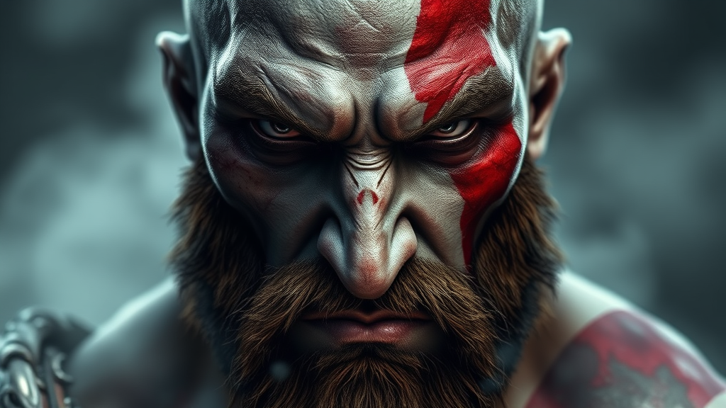 Close up portrait of God of War Kratos, hyperrealism, epic composition, intense and gritty atmosphere, enveloped in mist, octane render, 8k resolution, maximum details, dynamic volumetric lighting, hdr, high quality and intentionally low quality contrast, blurred elements, plastic-like texture, slight grain effect, duplicate appearance, awkward anatomy, distorted limbs, unintelligible text, abstract name, indistinct signature, visible watermark, intentionally poor quality, prominent jpeg artifacts.
