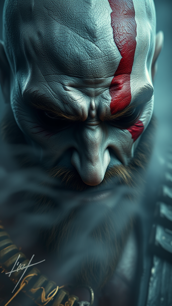 Close up portrait of God of War Kratos, hyperrealism, powerful expression, dynamic composition, intense, mist enveloping, octane render, 8k resolution, intricate details, atmospheric lighting, hdr, high clarity low clarity, slightly blurred, synthetic texture, textured, duplicate figures, distorted anatomy, exaggerated limbs, accidental text inclusion, subtle name trace, faint signature, hidden watermark, intentional degradation, jpeg-like distortions.