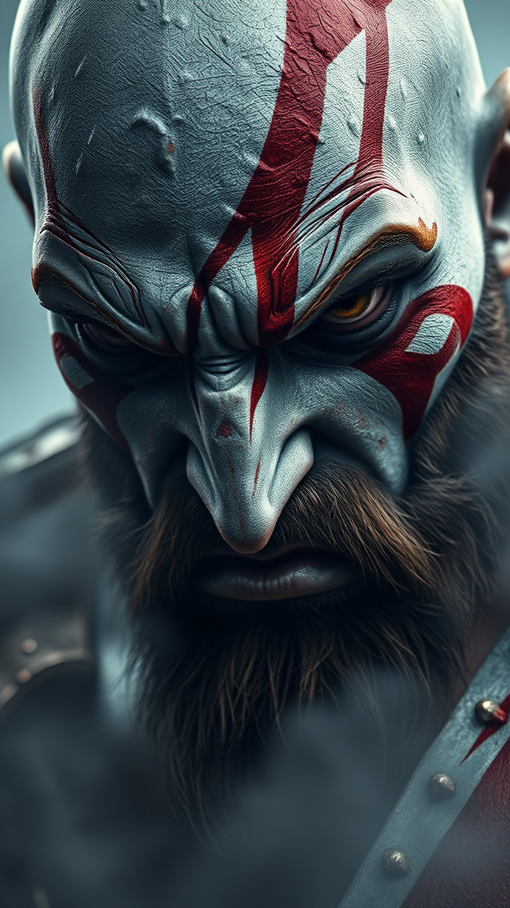 Close up portrait of Kratos from God of War, hyperrealistic depiction, epic composition, fierce expression, enveloped in mist, rendered with octane, 8k resolution, intricate detailing, volumetric lighting, HDR effect, a mix of high and low quality elements, subtle blurring, plastic-like texture, grainy appearance, duplicative visuals, slightly distorted anatomy, awkward limb positioning, scattered text, visible name and signature artifacts, watermark presence, intentionally reduced quality, noticeable jpeg artifacts.