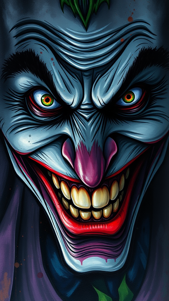 Close-up portrait of the Joker's face in Arkham Asylum, captured with a blend of painting and illustration techniques. His grotesque, exaggerated grin and wild, deranged eyes, with intensely dilated pupils, are simultaneously unsettling and manic. The dark, sinister background enhances the psychological intensity of the villain. Illustrated using a vibrant mix of acrylics, watercolors, and ink splatters, the artwork showcases dynamic, textured visuals. The composition challenges the bounds of traditional graphic novels with distorted perspectives and jagged, expressionistic lines, creating a sense of unease and disorientation. This emphasizes the Joker's mental instability and the chaotic reality of the asylum environment.