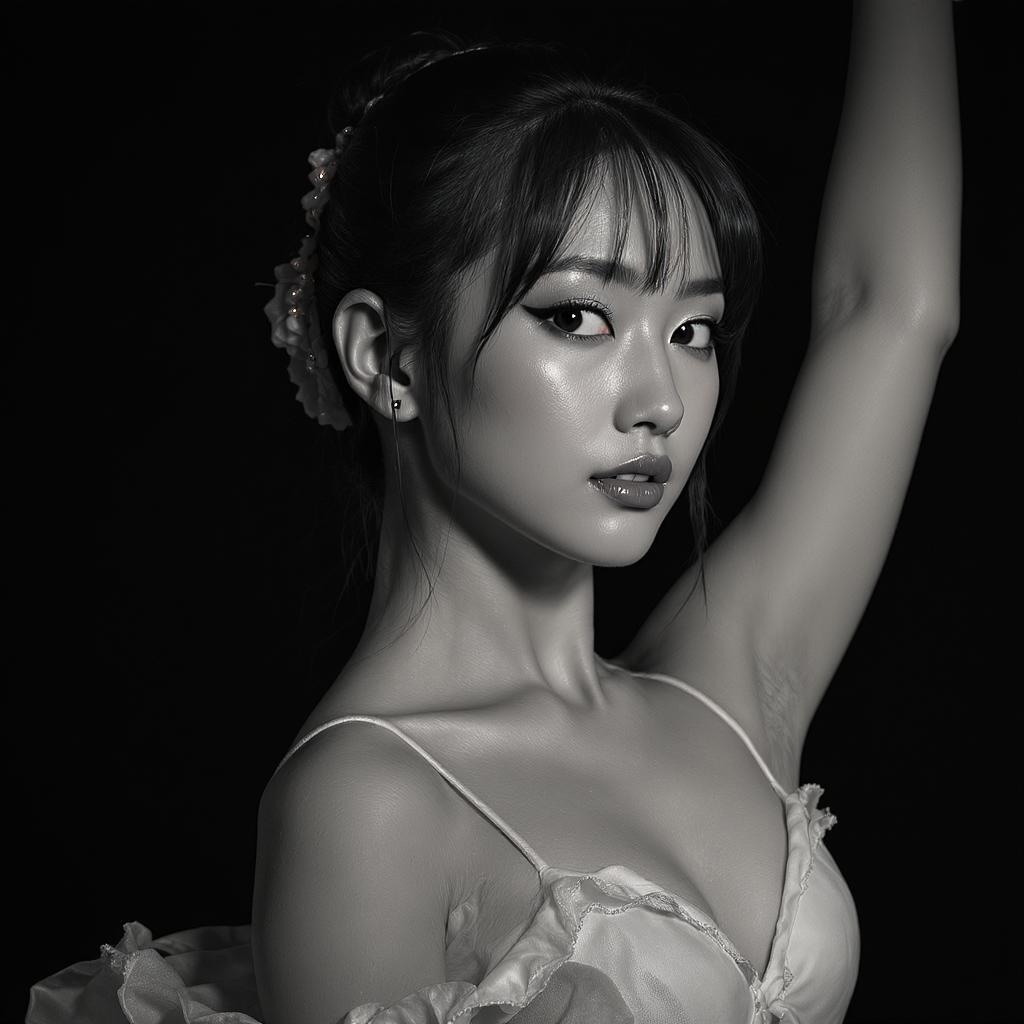Close-up portrait photograph of Yabuki Nako as a stunning ballerina in an elegant pose, highly detailed, intricate, sharp focus, depth of field, f/2.8, 50mm, ultra-realistic, aesthetic, 4k UHD, DSLR, natural makeup, intricately styled hair bun, beautifully symmetrical face, perfect form, capturing poise and grace. Influenced by Mikhail Baryshnikov, Misty Copeland, Roberto Bolle, Sylvie Guillem. Full-body sketch of a subtly dynamic figure in a fluid pose, emphasizing natural movement and expression, artistic contrasts, monochrome, conveying emotion, yet maintaining balance and proportion, with artistic flair.