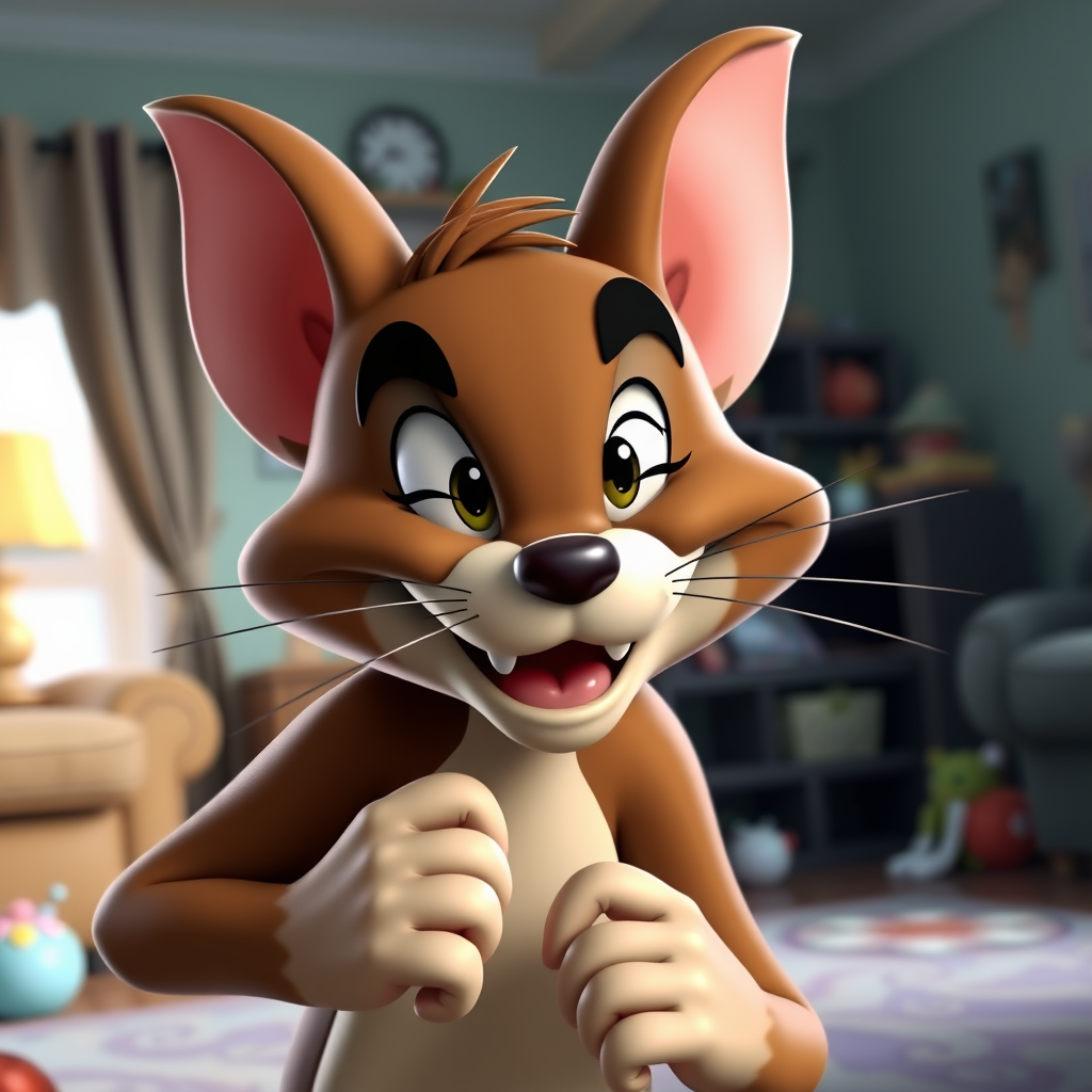 Close-up rendering of a mischievously grinning Jerry the mouse, plotting devious schemes, with a twinkle in his eyes, 3D render style, featuring Jerry's classic brown and tan hues from the iconic Tom & Jerry cartoons by Hanna-Barbera. His whiskers twitch with anticipation and the background subtly hints at a chaotic living room setting, filled with elements of mischief and playful chaos.