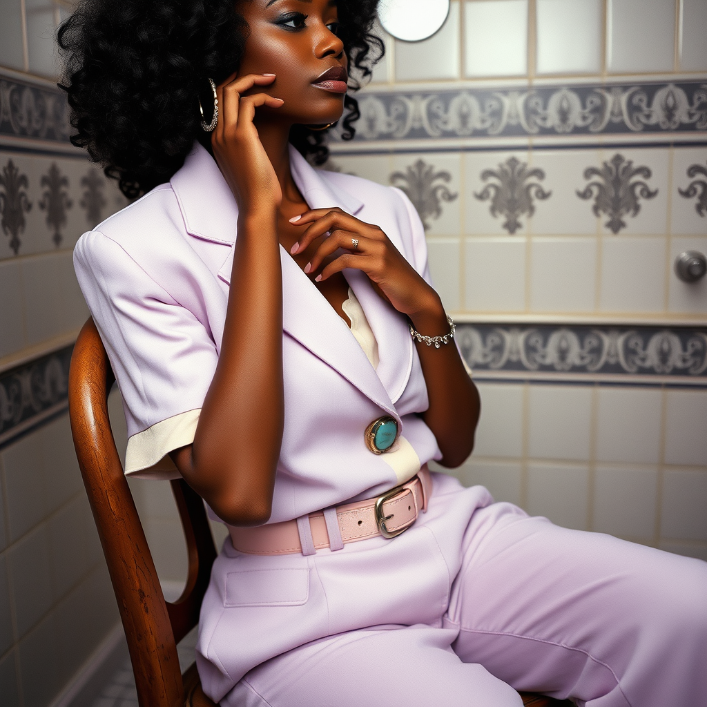 Close-up retro FlicFilm Elektra 100 photo of an elegant model wearing a soft pastel lavender western suit with a cream short-sleeved shirt and a bolo tie featuring a stunning turquoise stone, seated on a vintage wooden chair. The model, with deep brown skin and cascading curly black hair, gazes thoughtfully away from the camera. They are adorned with delicate hoop earrings and intricate silver jewelry. A sleek pink Italian leather belt accentuates the ensemble. This fashion editorial was shot for French Vogue, inspired by the style of Jacquemus, and takes place in a vintage washroom with ornate tiled walls, creating a unique juxtaposition of elegance and nostalgia. The model's hand gently grazes their cheek, adding an air of contemplative allure.