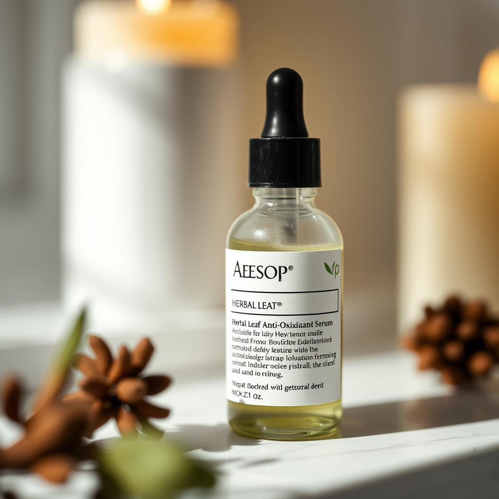 Close-up shot, Aesop's Herbal Leaf Anti-Oxidant Serum, captured with a Nikon Z7 II, highlighting the serum's sophisticated packaging and natural essence, in a cozy, gentle light ambiance.