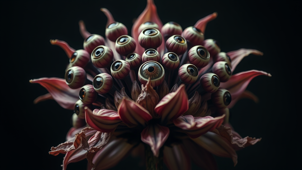Close-up shot, centered, Instagram-worthy, sharp focus, mythical flower adorned with numerous eyes reaching skyward, wilted petals, hyper-realistic, Tim Burton-inspired, dark fantasy theme, expert photography, studio lighting, deep depth of field, raw image, wide-angle view.