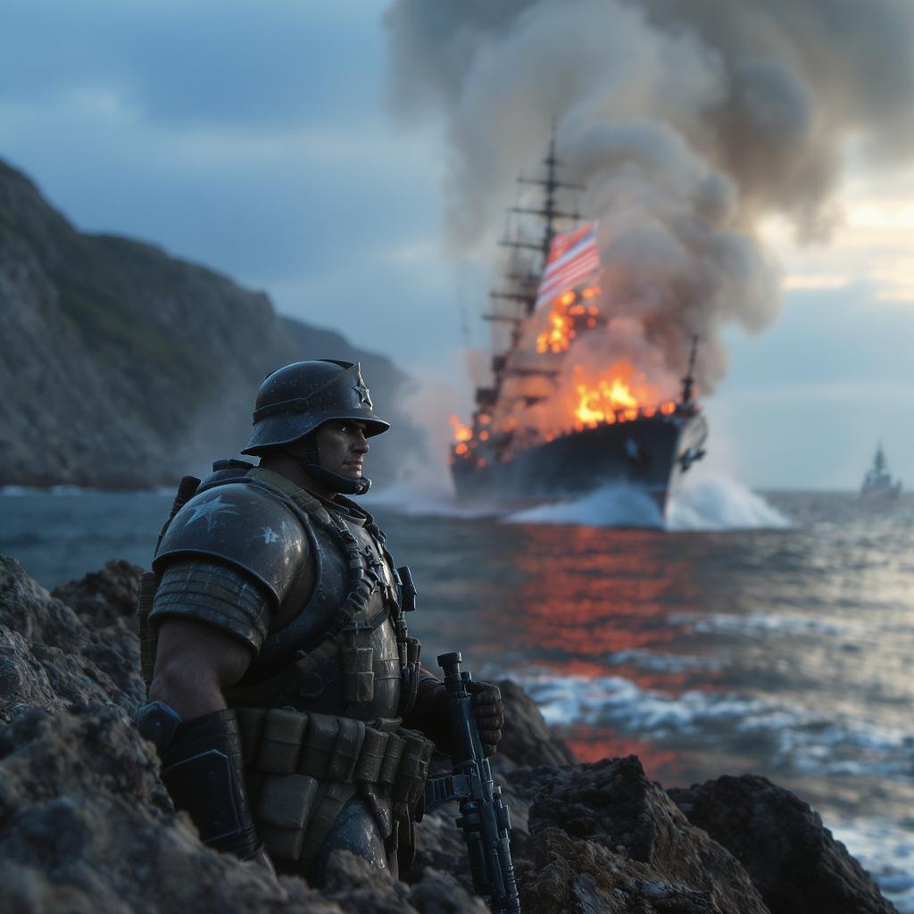 Close-up shot, detailed soldier figurine, positioned on a rocky coastline, against the backdrop of a naval ship, engulfed in flames, slowly descending into the sea, illuminated by gentle, diffused lighting, ratio 3:4.