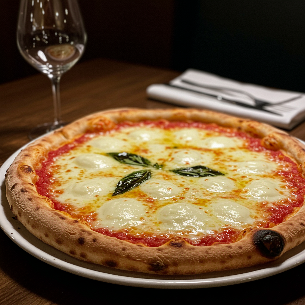 Close-up shot of a gourmet sourdough pizza topped with generous amounts of extra melted mozzarella, exuding a tempting aroma. The high-end food photography captures its mouth-watering appeal with a clean composition and dramatic lighting, emphasizing its luxurious and indulgent nature. Shot with a Nikon Z7 using a 105mm lens, the image centers on the pizza, bathed in soft directional light set to evoke an elegant evening ambiance. Styled meticulously by a food stylist, the interior setting adds to the gourmet allure.