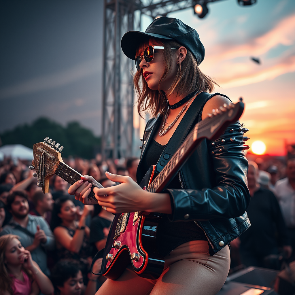 Close-up shot of a woman with an edgy, asymmetrical bob playing a face-melting electric guitar solo amidst a frenzied crowd of adoring fans on a sweltering summer evening in the still-light of a late-summer outdoor festival, wearing a black newsboy hat angled to one side, a pair of sleek, mirrored aviators, and a black, off-the-shoulder bodysuit that's clinging to every curve as she cowbells and bends her knees to connect with the music, all of it illuminated by the gaudy stage lights with their pinpoint beams that send shards of brightness scorching through her black leather jacket with metal spikes and banding, necklace straps encircling her neck an assemblage of glittering Christian Louboutins grasped in one hand, sweat glistening on her forehead and upper lip, set against a luminous evening sky streaked through with pinkish-orange hues as the sun dips hastily toward the Western horizon