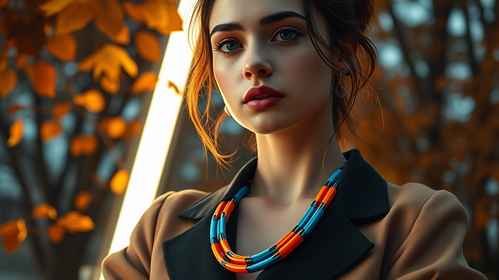Close-up shot of a young woman in chic, tailored attire inspired by Hubert De Givenchy, featuring rolled-up sleeves and a striking upside-down orange and blue body chain. Set in a fall scene with hints of spring, the atmosphere is hopeful and futurepunk, accentuated by the glowing presence of a cathode tube. Her expression is serene amidst a photorealistic, low contrast backdrop, capturing a blend of realism and low poly aesthetics.
