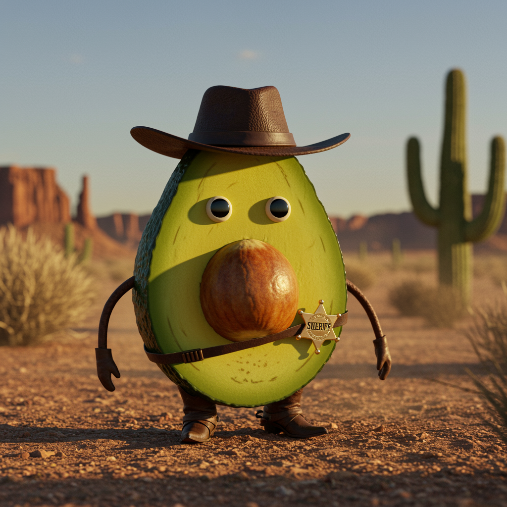 Close-up shot of an avocado styled as a desperado, set in a wild west landscape with dusty plains and rugged terrain, highly detailed leather hat and boots, a glinting sheriff's badge made of avocado pit, cactus and tumbleweeds in the background, photographic realism, 8k resolution, dramatic golden hour lighting casting long shadows across the scene.