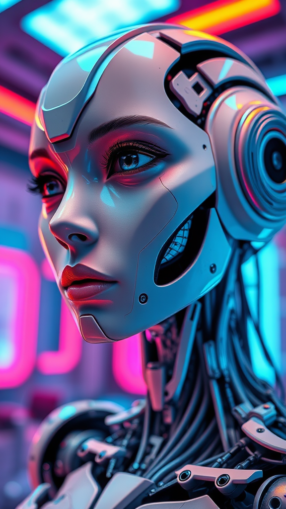 Close up shot portrait of an intricate robotic girl with a blend of android and humanoid features. Her detailed face showcases robotic eyes, nose, mouth, and lips, with an intricately designed robotic body. The ultra-detailed futuristic room interior serves as a vibrant and contrasting backdrop, adding to the cinematic and futuristic theme. The HDR and UDR effects enhance the dynamic range, while maintaining the essence of a masterpiece with professional work quality. The scene avoids any errors or imperfections, emphasizing a perfect amalgamation of human and robot aesthetics. The robotic girl has a humanoid face with expressive eyes, lashes, nose, and mouth capturing a girly and feminine essence. Her form is flawless, free from deformities, and the composition is compelling, focusing on the beauty of symbiosis between human and machine. The vibrant colors and futuristic setting evoke a sense of wonder and innovation, creating an unforgettable portrait in a high-resolution digital illustration.