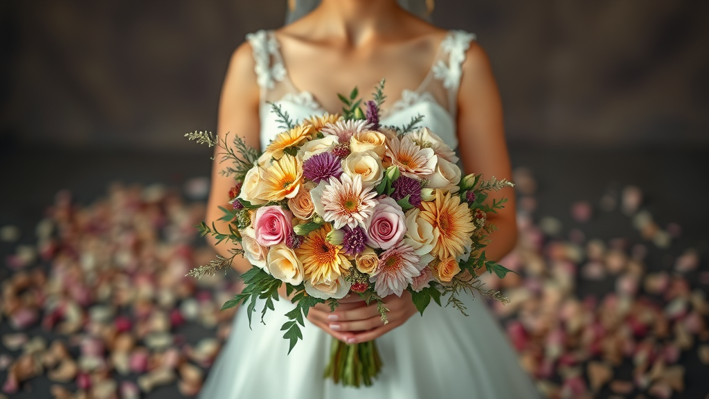 Close up shot upper body centered Instagram worthy dynamic pose holding a bouquet of flowers in a wedding dress scattered petals ultra realistic professional photography studio lighting depth of field raw image