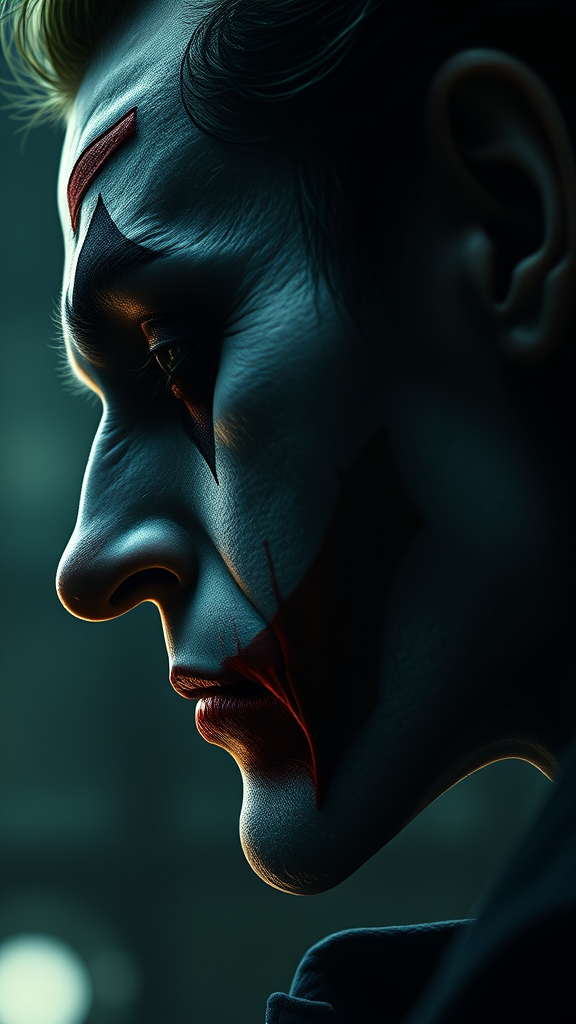 Close-up side view of an enigmatic joker, inspired by the style of Christopher Nolan, exuding intelligence and seriousness within a calm yet unsettling atmosphere. The scene is enveloped in horror with dramatic lighting that highlights the emotional depth. This digital painting achieves hyper-realism with maximum detail, drawing from the intricate styles of Milo Manara and Russ Mills, and is rendered in unforgettable 8K quality. Despite an intention for perfection, elements become abstract with qualities of low resolution, distorted features, and unusual proportions. The face and limbs appear duplicated and mutated, with an elongated neck and disfigured features, enhancing a sense of unease. The piece is free of any unnecessary details like camera signatures or watermarks, prioritizing a raw and haunting essence.