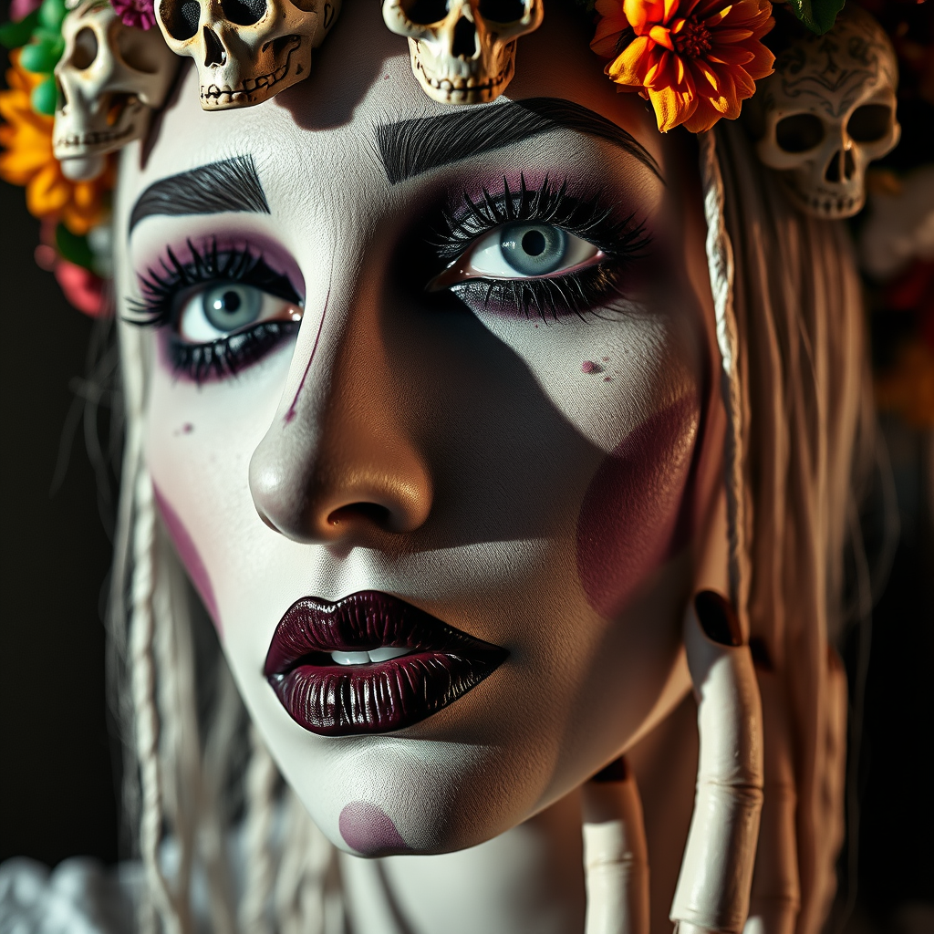 Close-up surrealistic portrayal, a woman with an intricately detailed face, dark purple lips contrasting against pale skin, crown of vibrant Mexican ornamentals, dramatic lighting casting shadows, unsettlingly realistic, face intertwined with skull motifs, features mutated in a fascinating blend, monochrome tones with splashes of color, nose depicted with odd abstraction, a puppet-like presence, dismemberment hinted subtly within composition.