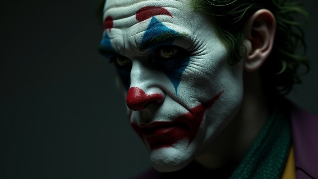 Close-up view of an enigmatic joker from the side, capturing the style of Christopher Nolan with an intelligent, serious, and calm demeanor. The atmosphere is unsettling, leaning into horror, with dramatic lighting that enhances emotional depth. The digital painting is hyper-realistic, with maximum detail inspired by Milo Manara and Russ Mills, ensuring an unforgettable experience in 8K resolution. The scene is intricate, featuring intentional imperfections such as subtle jpeg artifacts, adding to the eerie aesthetic. The character has distinct, expressive features without crossing into the grotesque, maintaining a balance between realism and the surreal. The anatomy and proportions are slightly exaggerated for artistic effect, yet the figure retains a human-like essence. The painting avoids unnecessary distractions such as watermarks, logos, or signatures, focusing solely on the impactful portrayal of the joker.