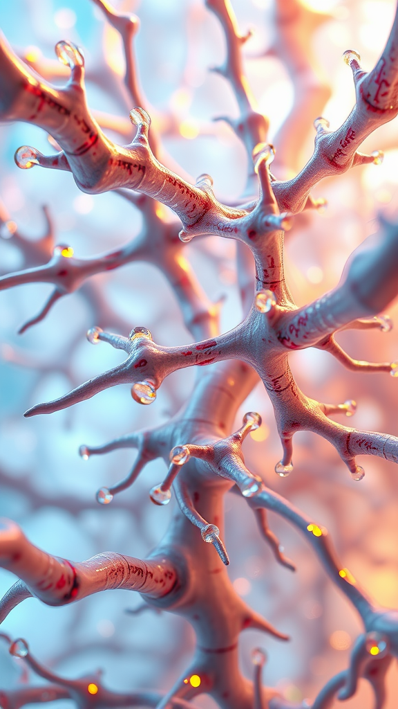 Close-up view of intertwining spikes with transparent hues, highlighting vray tracing features; molecular structures blend with twisted branches, evoking holography. Zbrush elements merge with foampunk aesthetics, casting a luminous sfumato glow. The scene embodies an ethereal and futuristic raw style, emphasizing a vertical 9:16 aspect ratio.