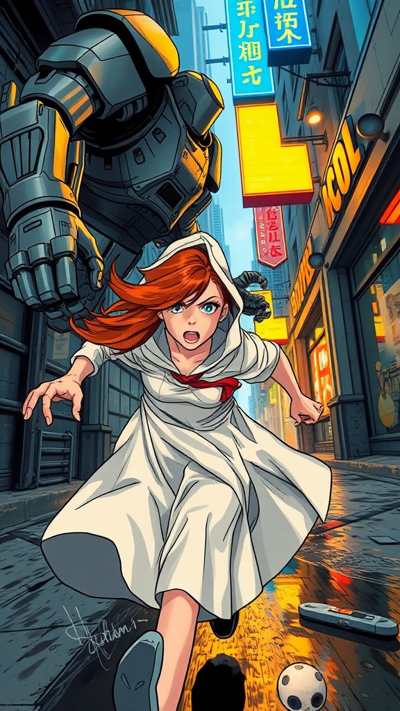 Closeup image of two subjects, a girl with auburn hair in a flowing white hooded dress, an expression of fear on her face as she runs desperately, pursued by a towering armored figure. His metallic hand reaches out, fingers grasping as they race through a gritty alleyway in a futuristic city. Neon blue and yellow signs flicker overhead, casting vibrant reflections on the wet pavement. A dynamic scene unfolds, with dramatic angles accentuating the tension. The artwork is in a vivid comic book style, emphasizing thick outlines and lifelike textures. Realistic hands and skin tones add depth, while action lines and motion blur create a sense of speed and urgency.
