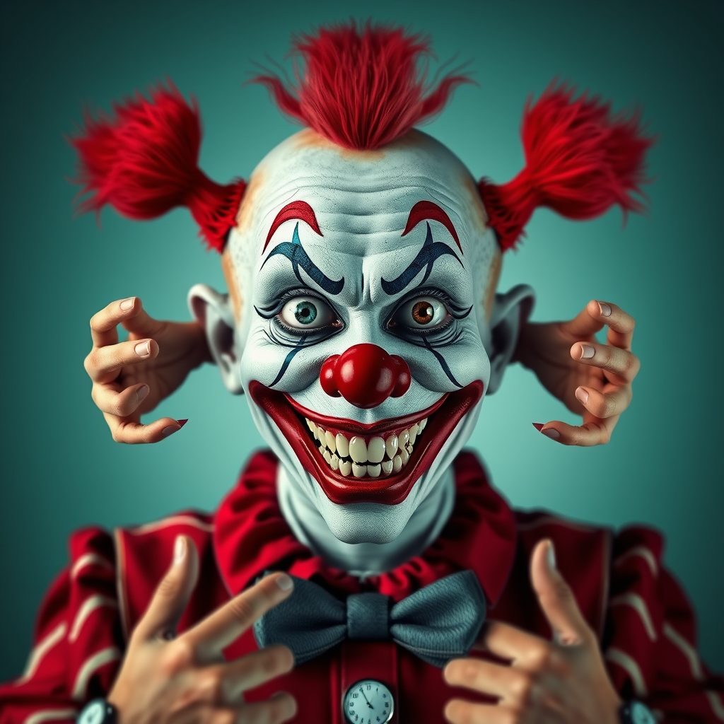 clown world 8k uhd hdr surreal altered reality distorted features duplicate mutation mutated cloned face cross eyed extended neck multiple fingers deformed hands abstract low resolution out of frame blurred jpeg artifacts watermark symbols fragmented cartoon split images