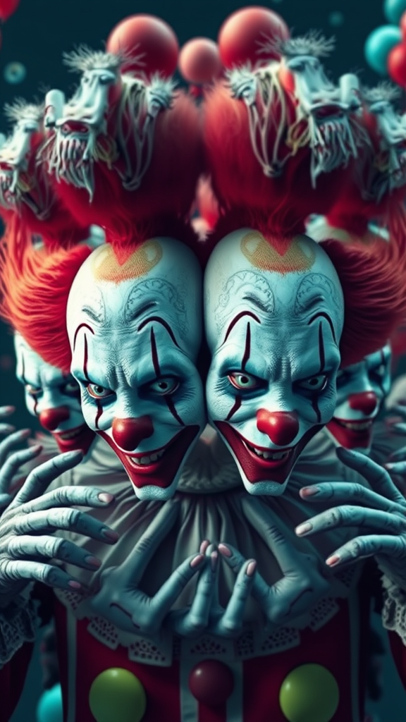 Clown world chaos, 8k ultra-high definition, vibrant HDR colors, surreal and bizarre, duplicate features, mutant expressions, cloned faces with cross-eyed gaze, elongated necks, additional fingers, distorted hands, twisted reality, overlapping visuals, abstract forms, unrefined resolution, misaligned elements, out of focus, pixelated edges, digital noise, intrusive branding, unexpected text fragments, cut-off images, cartoonish distortions, fragmented scenes.