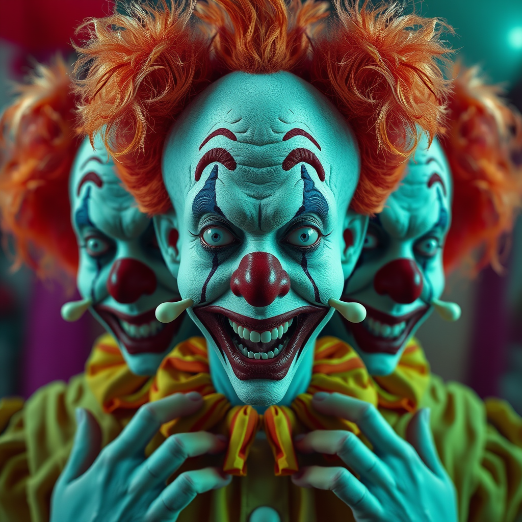 Clown world, ultra-high definition, vibrant HDR, surreal, bizarre elements, duplicated forms, genetic mutations, altered features, cloned expressions, crossed eyes, elongated necks, additional digits, distorted hands, confusion of identity, abstract, whimsical, fantastical, deformed symmetry, off-kilter visuals, low clarity, blurred lines, digital noise, pixelated presence, unintended overlays, brand marks, textual remnants, truncated, animated feel, divided visuals.
