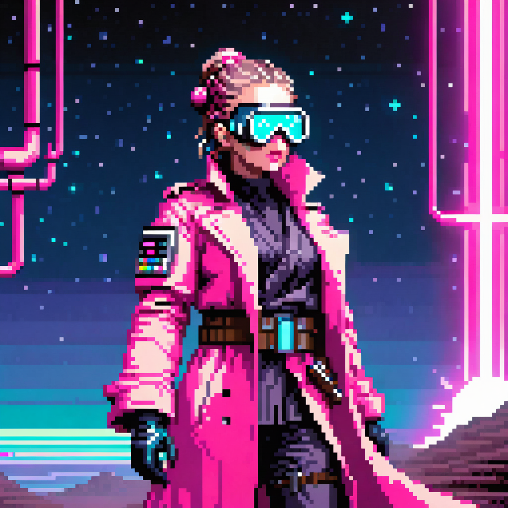 (jedi), (pixel art), detailed, torso, gloves, mask, goggles, action pose, trench coat, pink, surreal, strange, (full body photo), vaporwave neon theme, star wars, portrait, (upper body, looking away:1.1), stars