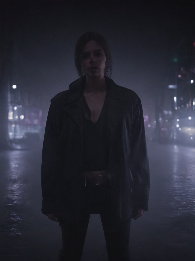 city street, neon, fog, volumetric, closeup portrait photo of young woman in dark clothes